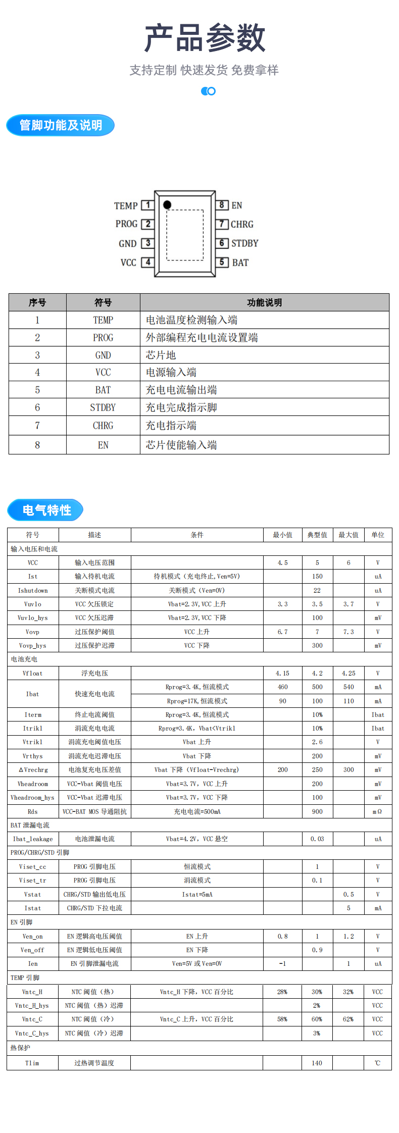 TC4059 具有电池温度检测(ESOP-8 及 DFN-8 封装)、EN 使能功能(ESOP-8 及 DFN-8 封装)、充电输入欠压保护、输入过压保护、电池反接保护、过热调节等功能,还可以监控充电电流,具有电压检测、自动循环充电的特性,并且带有二个指示管脚分别指示充电状态和充电终止状态。